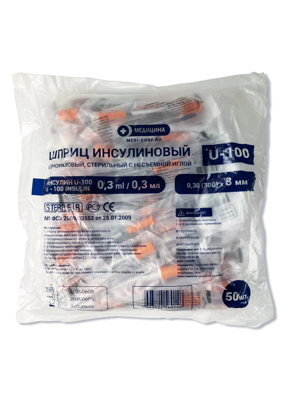 Шприц инсулиновый U-100 0,3мл. с иглой 0,30х8мм (30G)