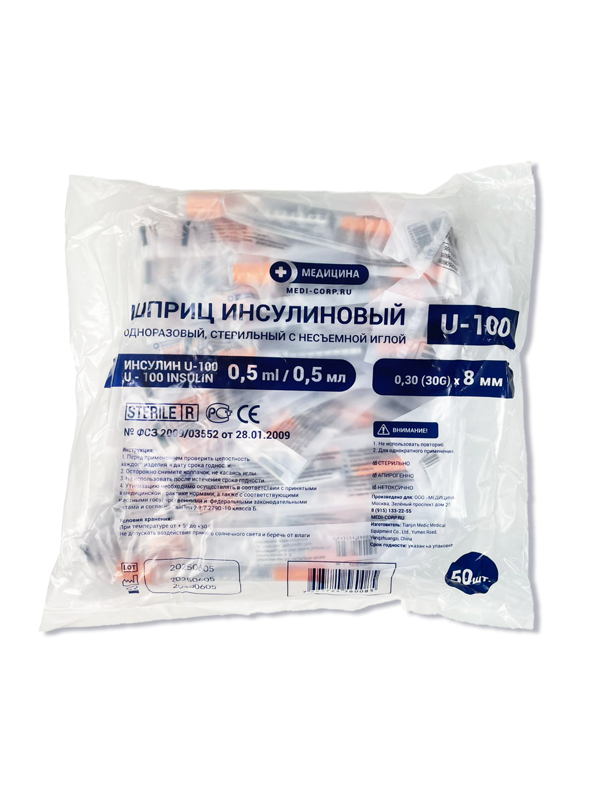 Шприц инсулиновый U-100 0,5мл. с иглой 0,30х8мм (30G)